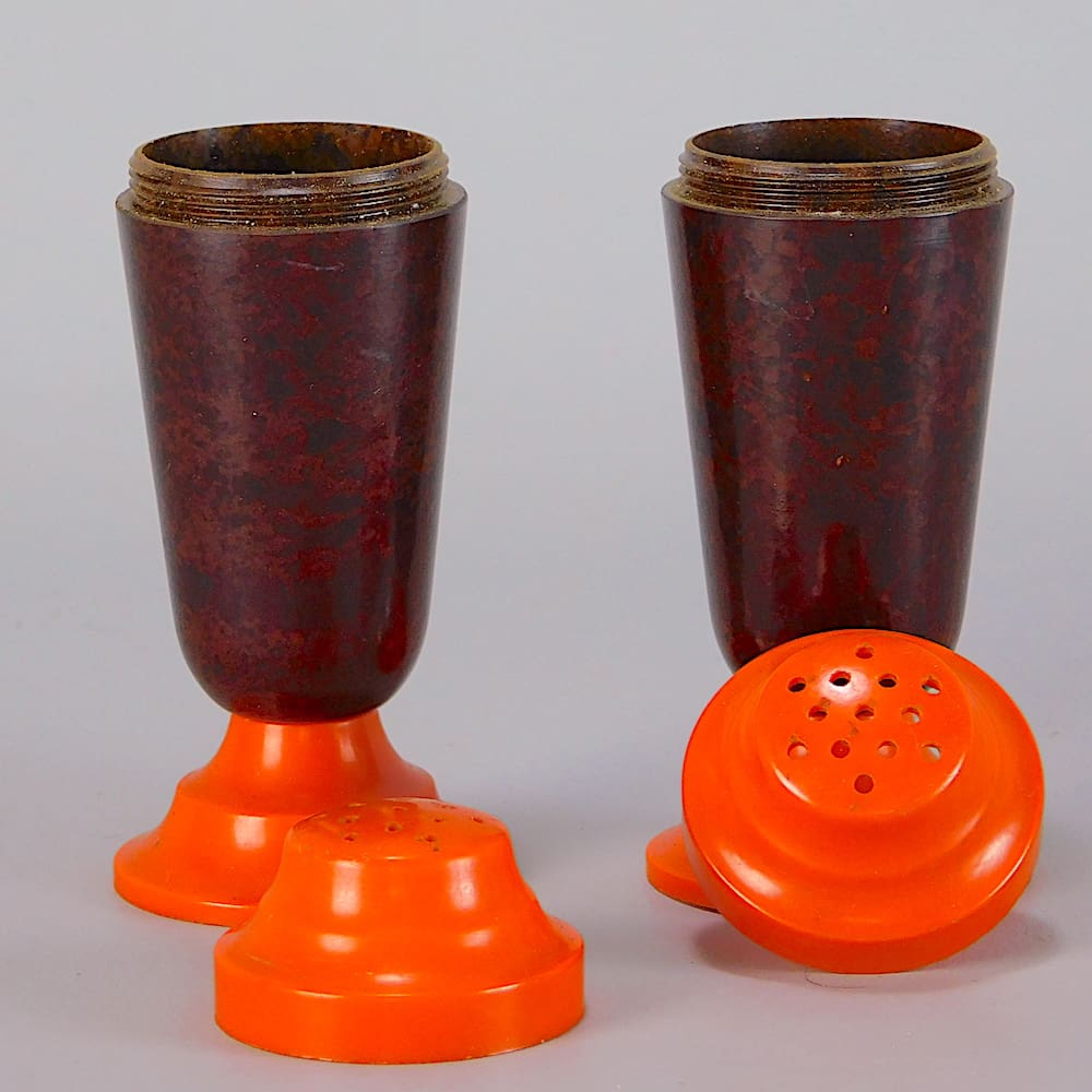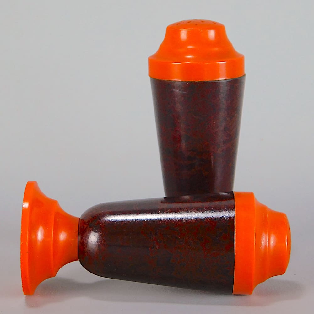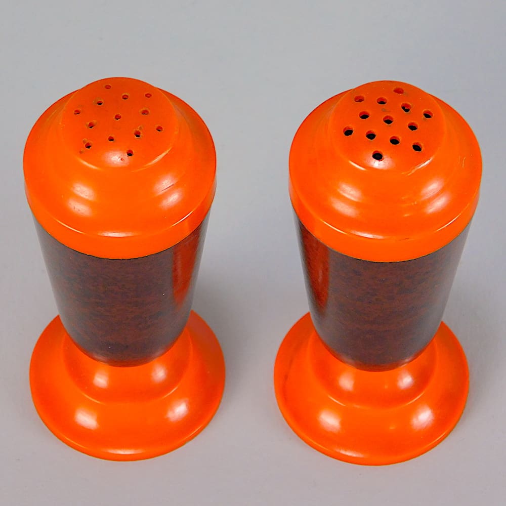 Orange and brown bakelite cruet set.