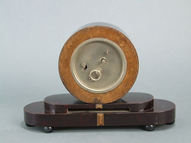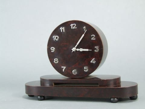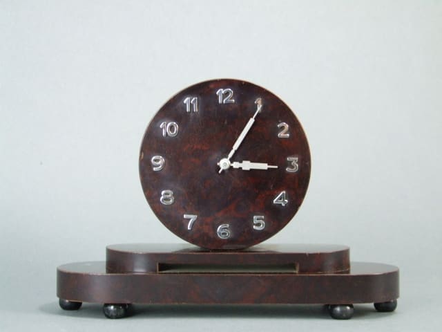 Smaller dark brown bakelite mantle clock with chrome deco numerals.
