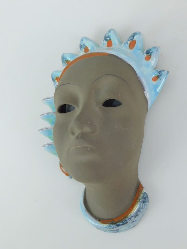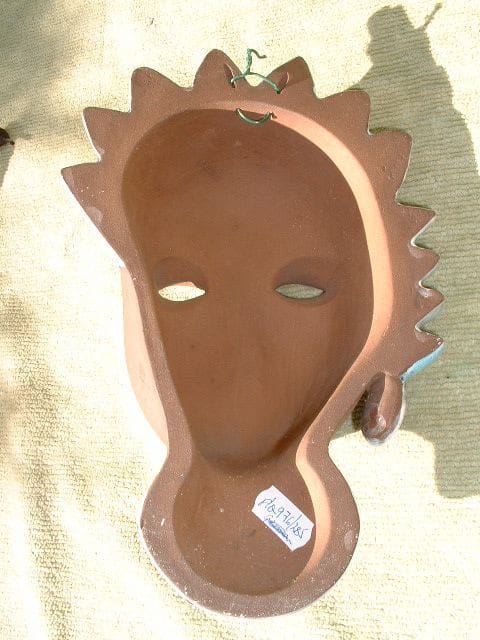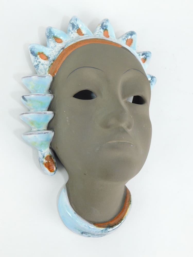 A rare terracotta wall mask made by Karlsruher Majolika – Manufaktur in 1929. As per usual for masks from this company signatures cannot be seen, but the same mask can be viewed in the Wondermasken book p115, model no. 3982.