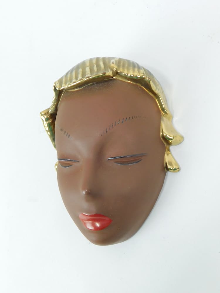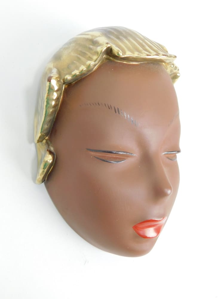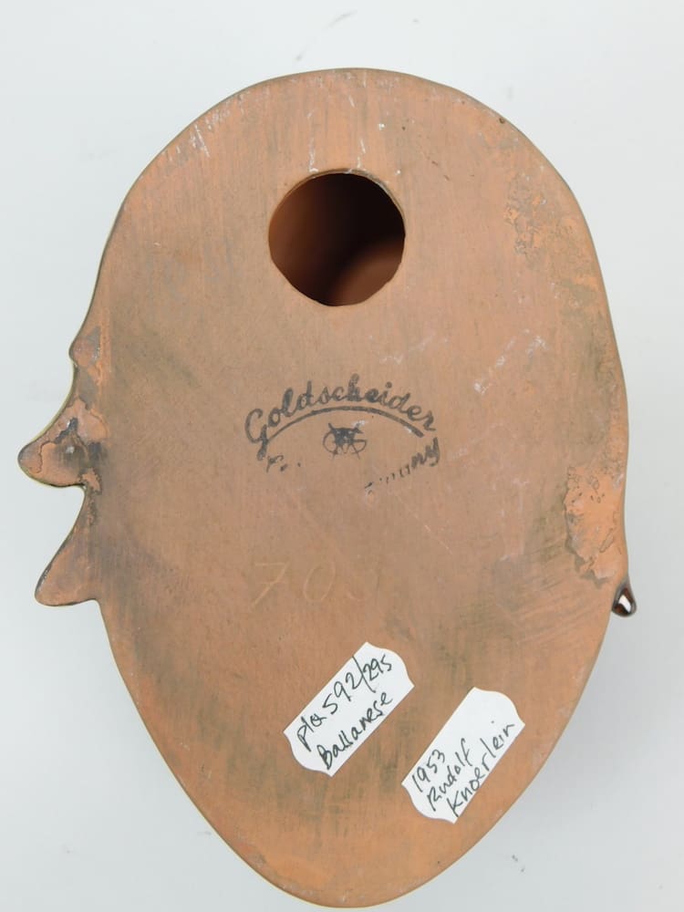 A wonderful terracotta wall mask, designed by Rudolf Knoerlein and made around 1953. It is a rare gold foil edition and to the reverse is the black Goldscheider, West Germany stamp and model number 703.