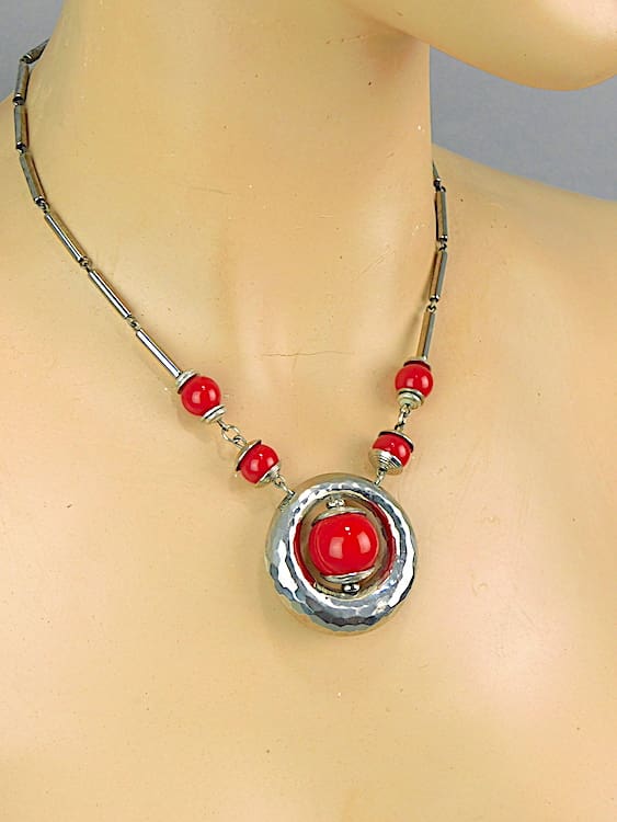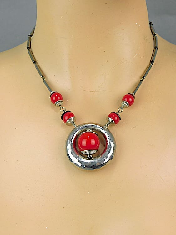 Shiny red galalith balls with a modernist ring central chrome panel, made by Bengel in the early 1930’s.
