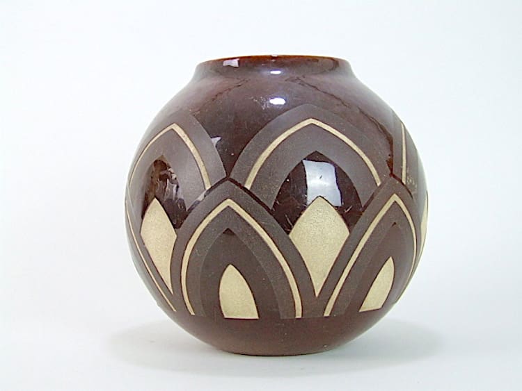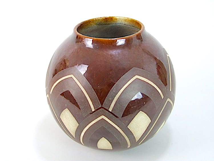 French art deco ball vase with geometric intaglio patterning and etching. This is a very heavy vase and I cannot work out if it is terracotta with a glass glaze or a glazed metal vase. The quality is exceptional and the inset areas have an almost stone like finish.