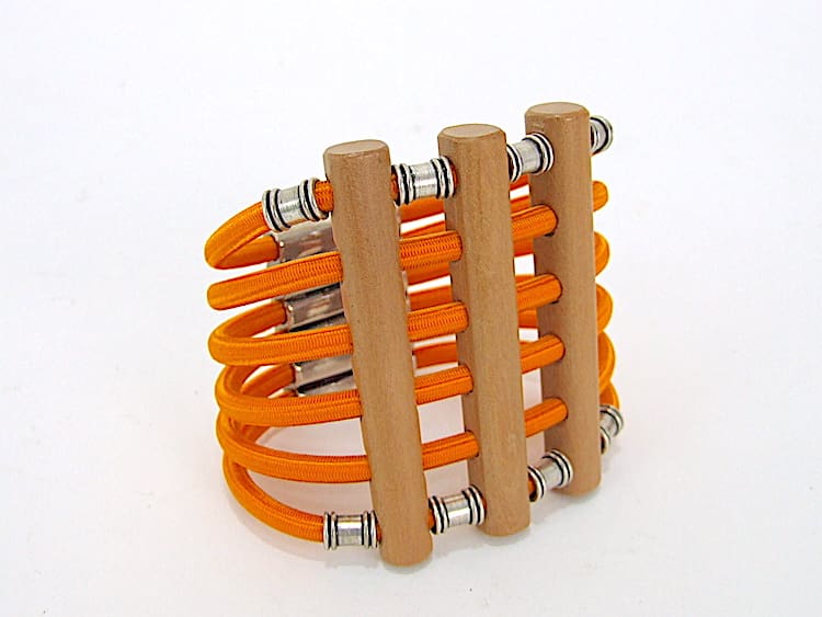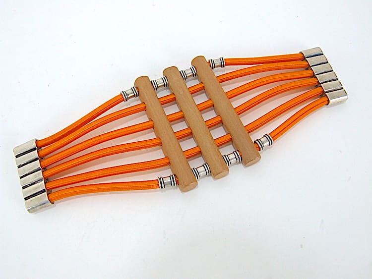 French Art Deco style orange cord and merisier wooden bangle by Max Debraine. It will fit a small to medium sized wrist and is elasticated. It fixes together by means of a magnet in typical Debraine style. This is a vintage piece and no longer in production.