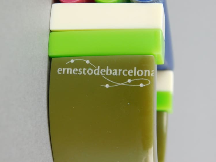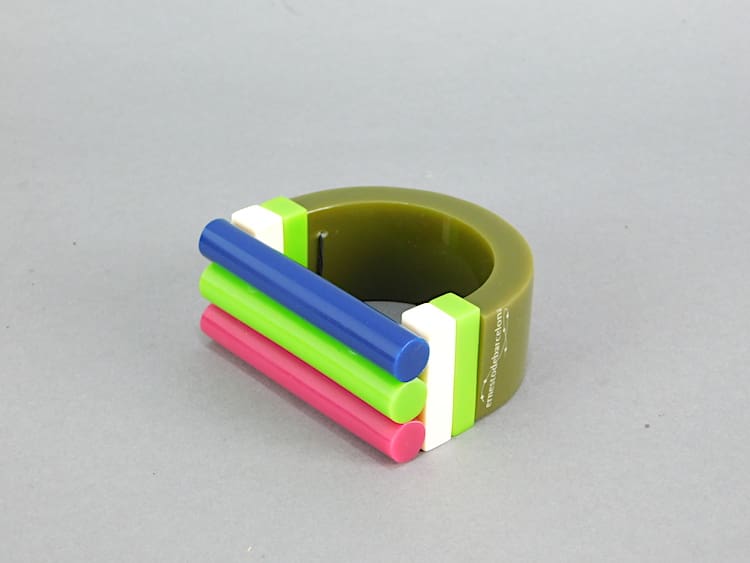Vintage multi coloured art deco phenolic chunky bangle, a signed piece by Ernesto de Barcelona. Probably dates to the 1960s – 1970s.