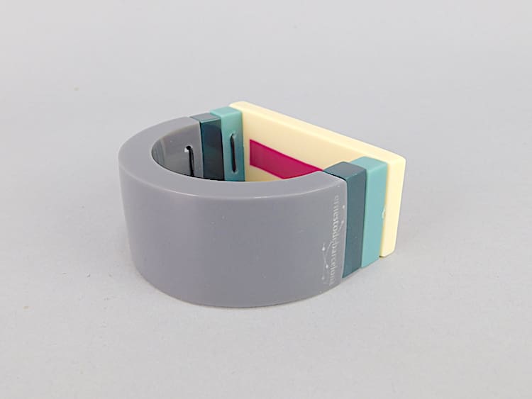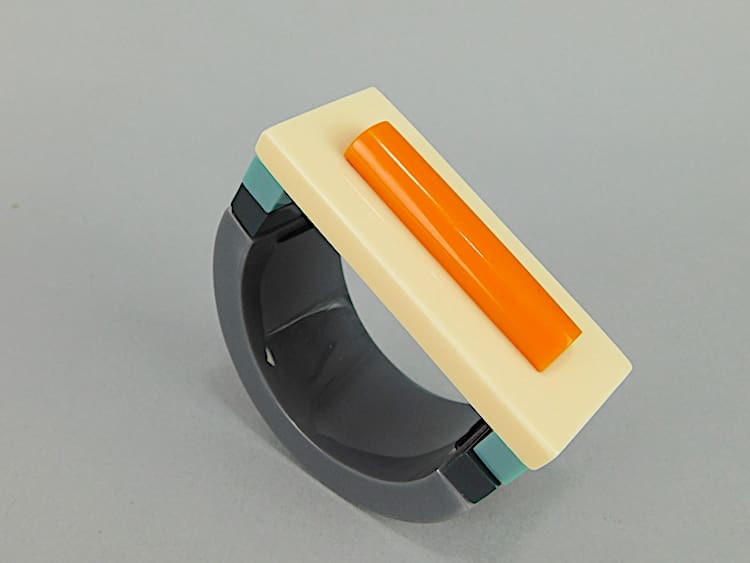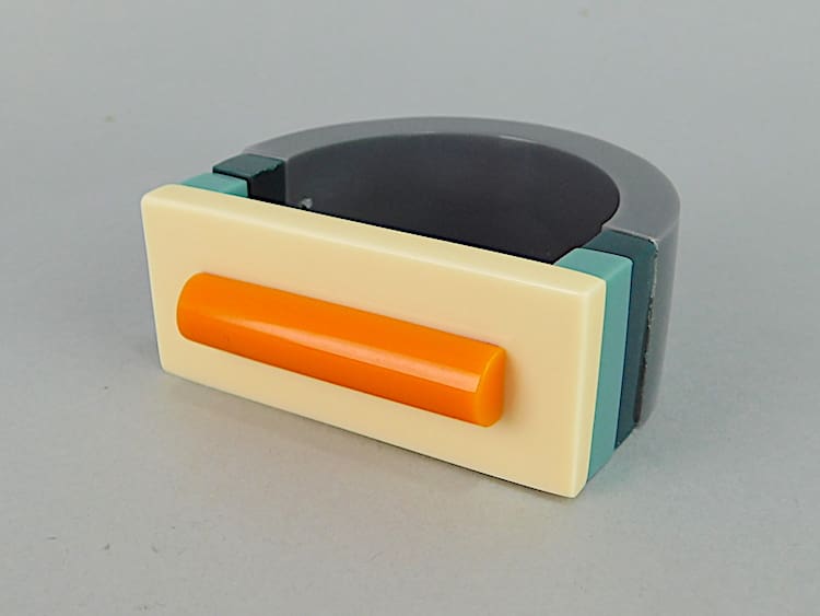 Vintage art deco multicoloured phenolic chunky bangle, a signed piece by Ernesto de Barcelona. Probably dates to the 1960s – 1970s.