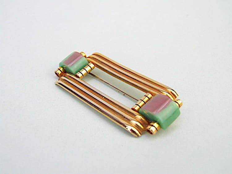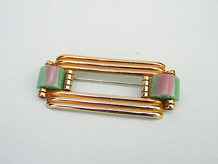 This bar brooch is made of gilt metal and turquoise/purple galalith. It was made in the early 1930’s by the Jakob Bengel factory for the French company of Fabon. They were hidden by the shop owner during the German occupation of Paris. Some are signed Fabon and some are not but they are undoubtedly by Bengel. Fitted with a push safety clasp.