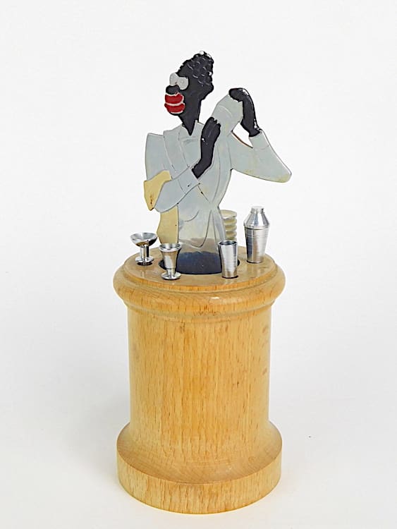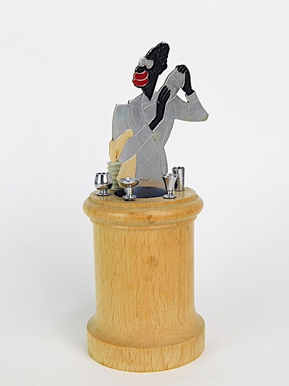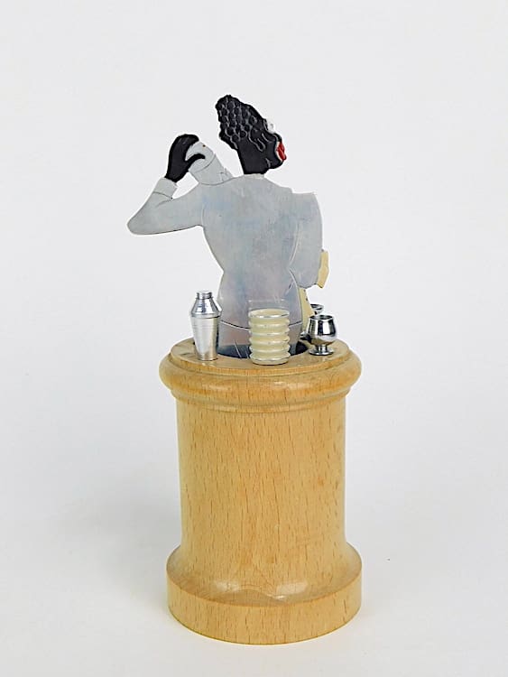 French art deco bar tender mounted on a spring in the centre of a wooden bar. Made by Sudre and unsigned but stamped Cado under the base – who were the company who made the Sudre pieces. The metal glasses and shakers on the bar are the cocktail sticks.