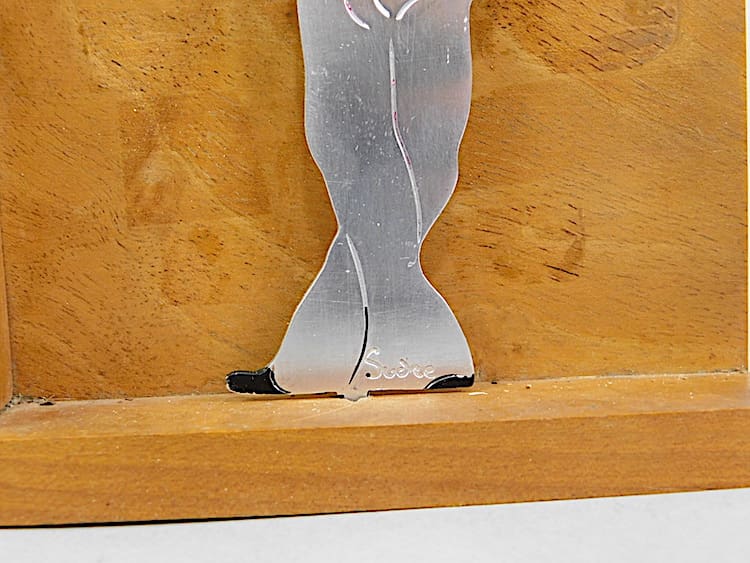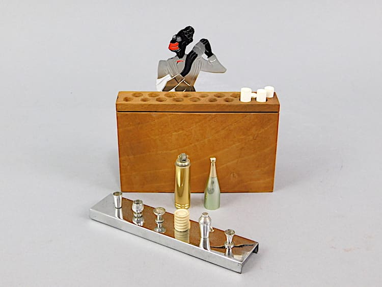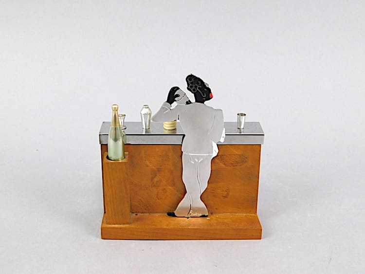 French art deco male bartender cigarette box. Slide the top of the bar items to one side to reveal the cigarettes inside.