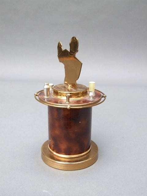 French two-dimensional bar tender, unsigned but I believe by Sudre. Pull the bar tender and bar top upwards and out pops a ring of cigarette holder tubes. Push him back down and the cigarettes disappear again.