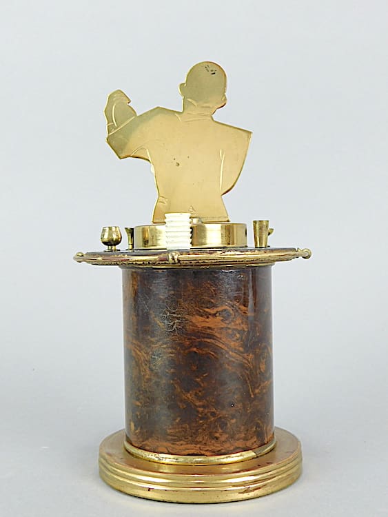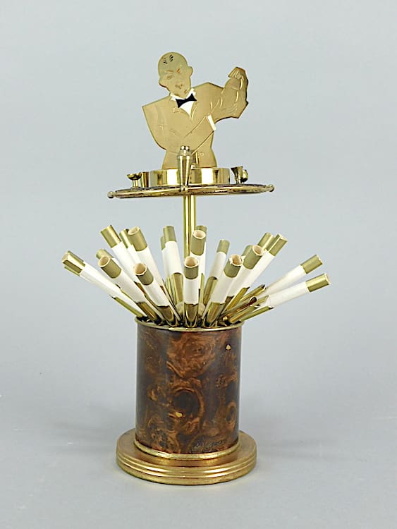 Art deco cigarette box. The brass cocktail waiter is mounted on a top with various cocktail bottles and shakers etc. Pull the lid up to expose the cigarettes.