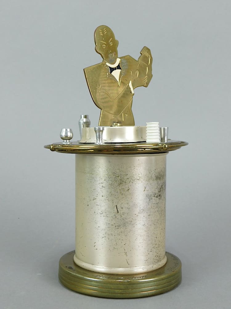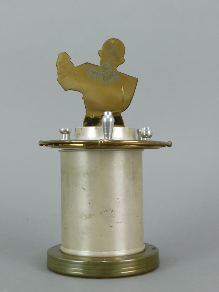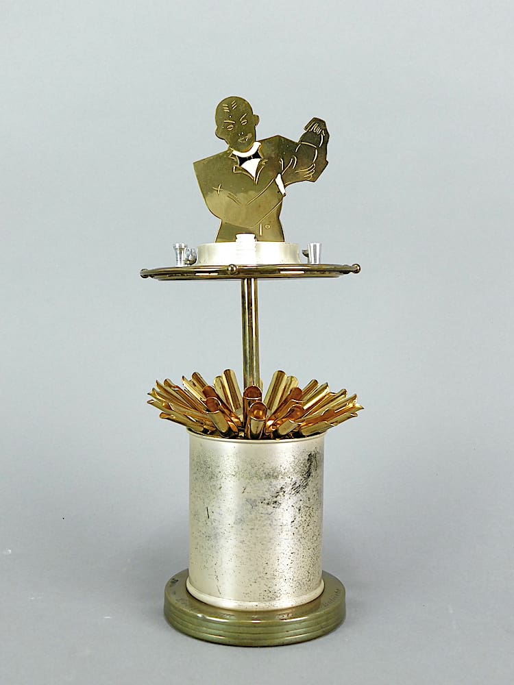 A bartender shaking cocktails at a bar surrounded by glasses etc. Pull the man up and the cigarette holders spring out. Push the man down to close it again. These very rare and wonderful items are made of a gilded metal sheet cut out in stencil fashion and the bartender has a jacket and bow tie detail etched on him, and is enamel painted. This one has white enamelling to the canister and was imported from Germany. It has an inscription in German to the base and is dated March 1955. But this is not necessarily its date of manufacture as I believe these were made in the 1920’s/30’s, but may have been continued until the 1940’s/1950’s.