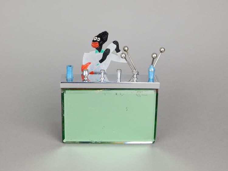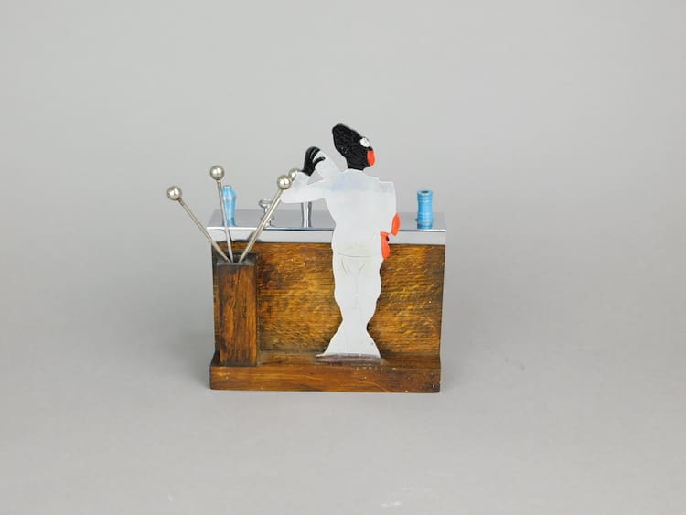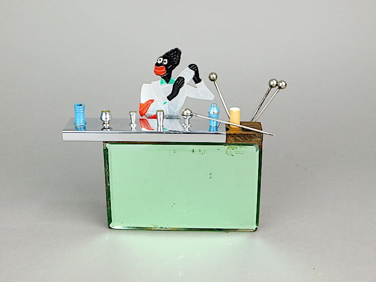 Whacky 1920’s bar tender man standing behind a green mirror glass bar with sliding chrome bar top – an unsigned piece by Sudre. When you slide the chromed bar top along, cigarettes pop up from the wood frame below.