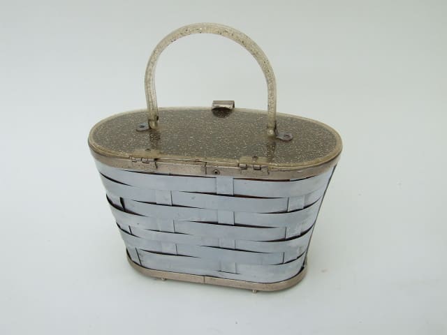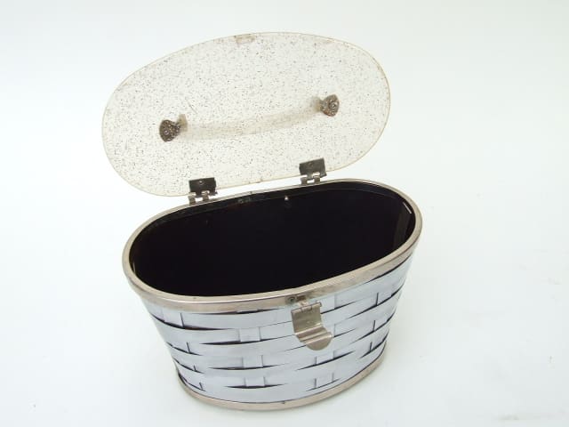 1950’s American chrome basket weave with lucite glitter lid and handle. Flared ovular shape. Inside it is lined in black satin card.