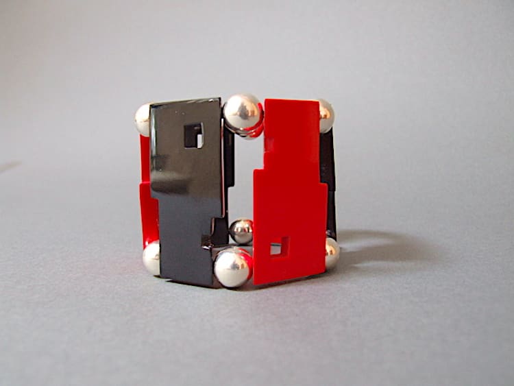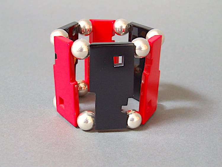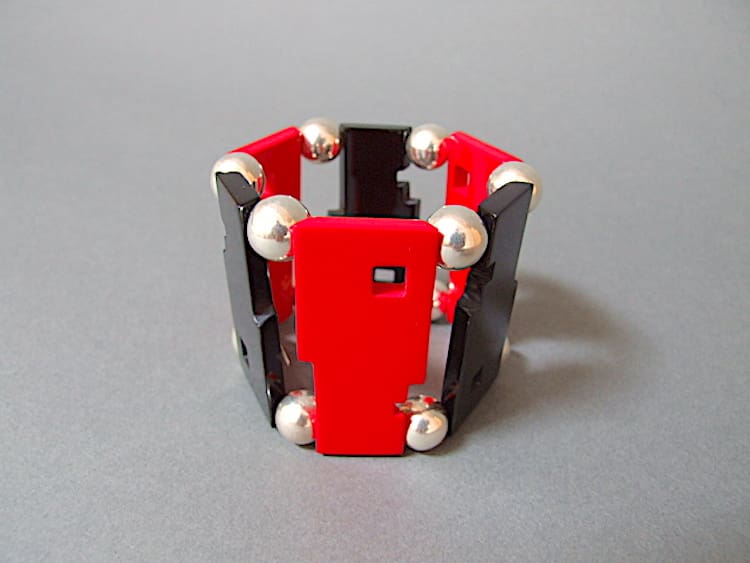 Guillemette L’Hoir made pieces of jewellery for the Paris sont au Musee des Arts Decoratifs during the 1970’s. This is a rare ‘Bauhaus’ bangle bracelet made of French galalith with red and black heads facing each other and with every other one upside down. It will fit most wrists as it is elasticated. It is signed to the back Francois Schoenlaub pour Guillemette L’Hoir Paris.