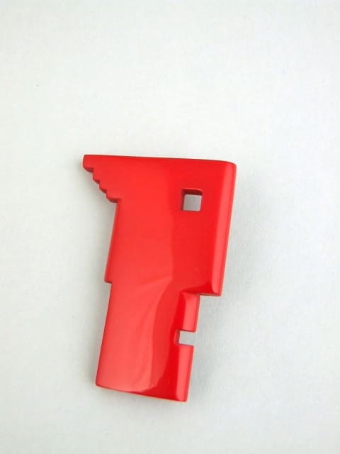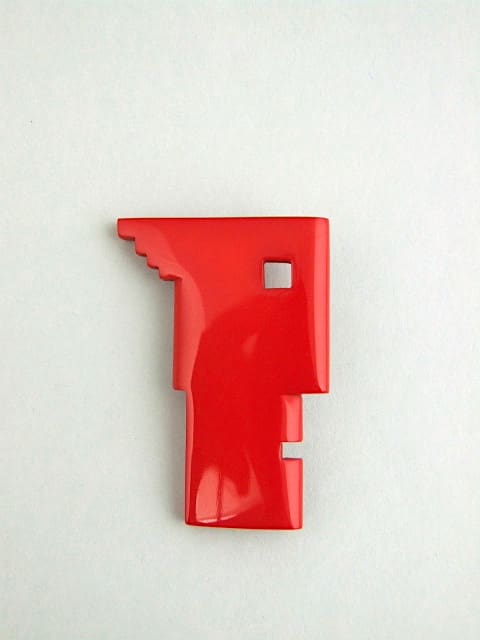 French Bauhaus style red galalith modernist head brooch. Stamped Francois Schoenloeb Par Guillemette L’Hoir, Paris to the reverse.