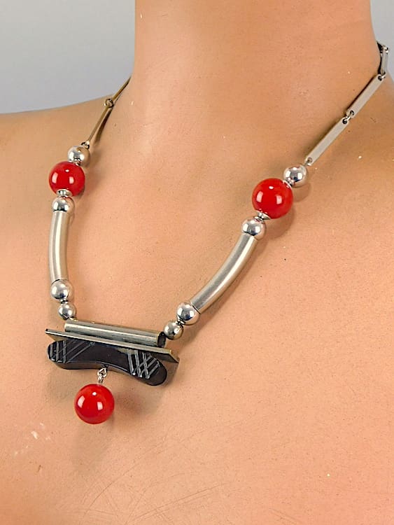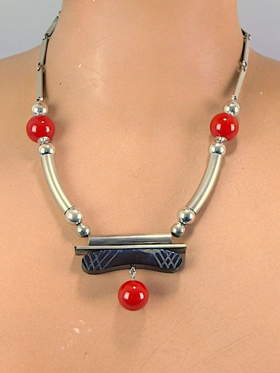 Early 1930’s red and black galalith and chrome necklace with unusual central design.