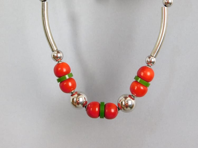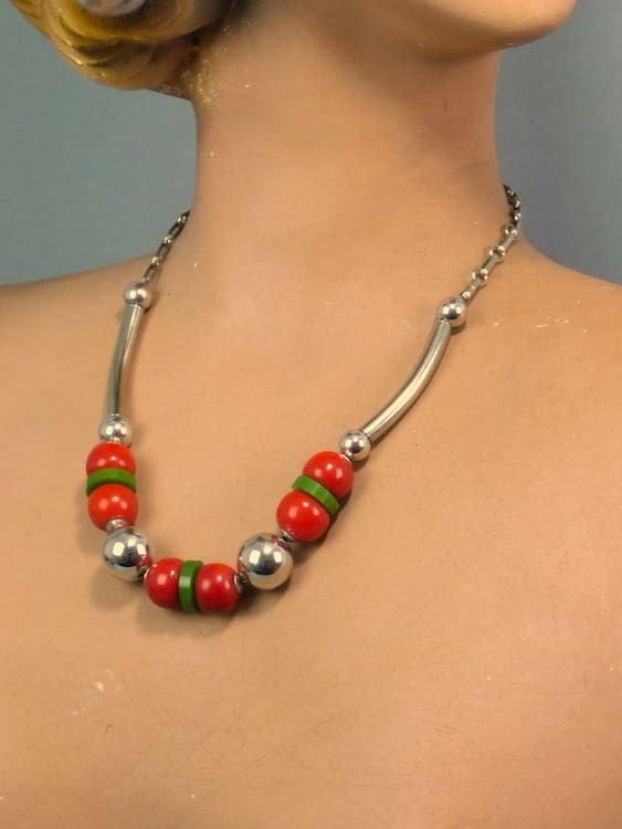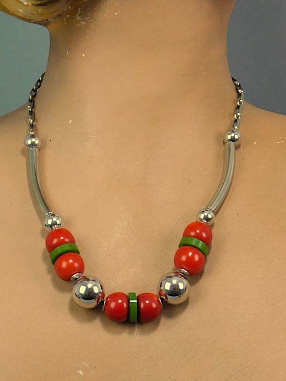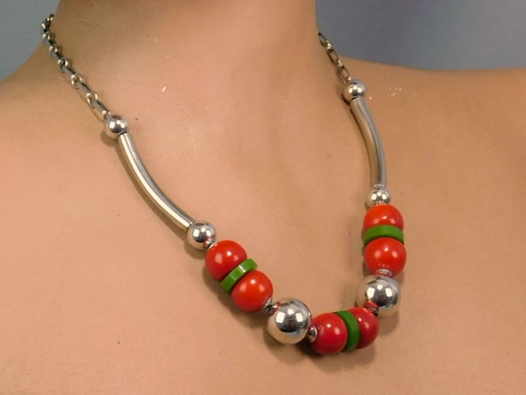 Art deco red and green galalith modernist necklace by Jakob Bengel.