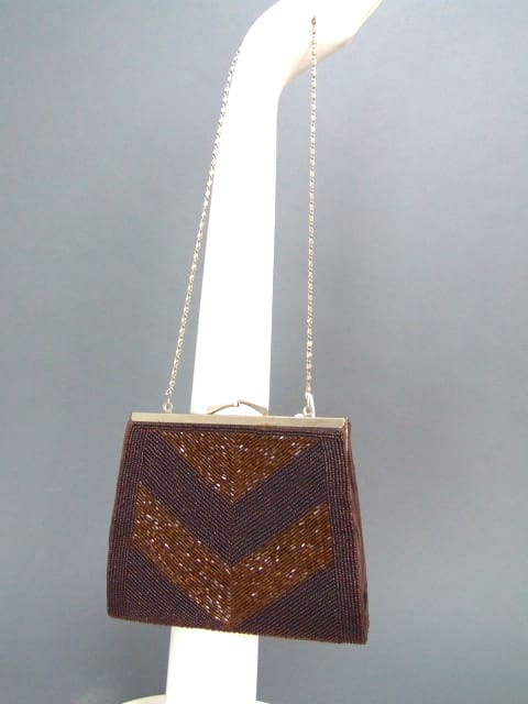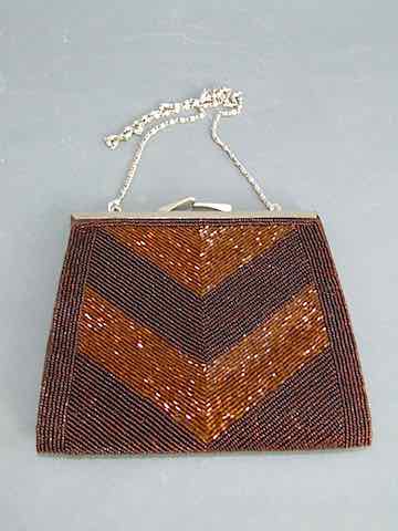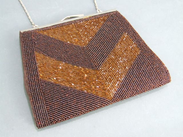 Original 1930s beaded hand bag in gold and brown beads with metal top clasp bar and chain mail handle