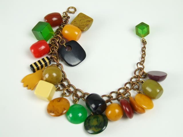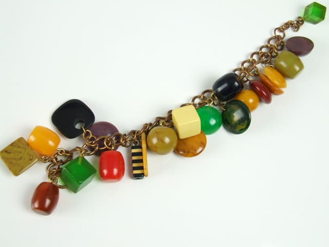 Phenolic bracelet with multi coloured and shaped beads and droplets.