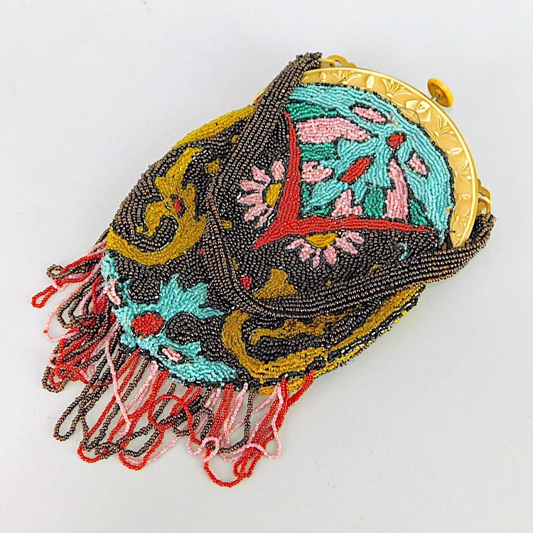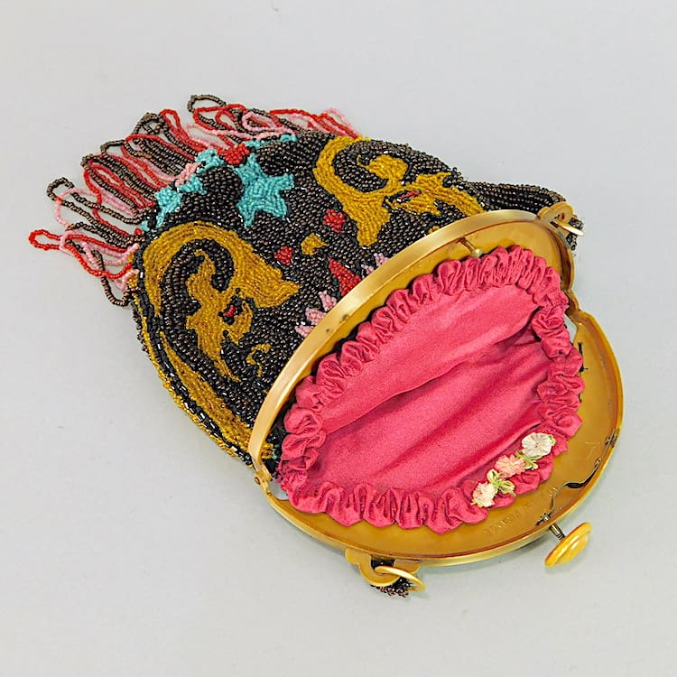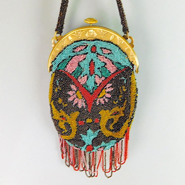 Multicoloured beaded flapper bag with Egyptian phenolic sphinx detail to the top bar.