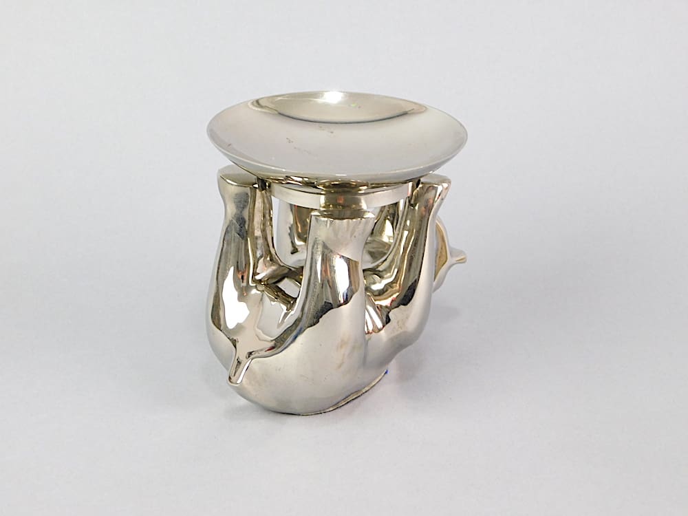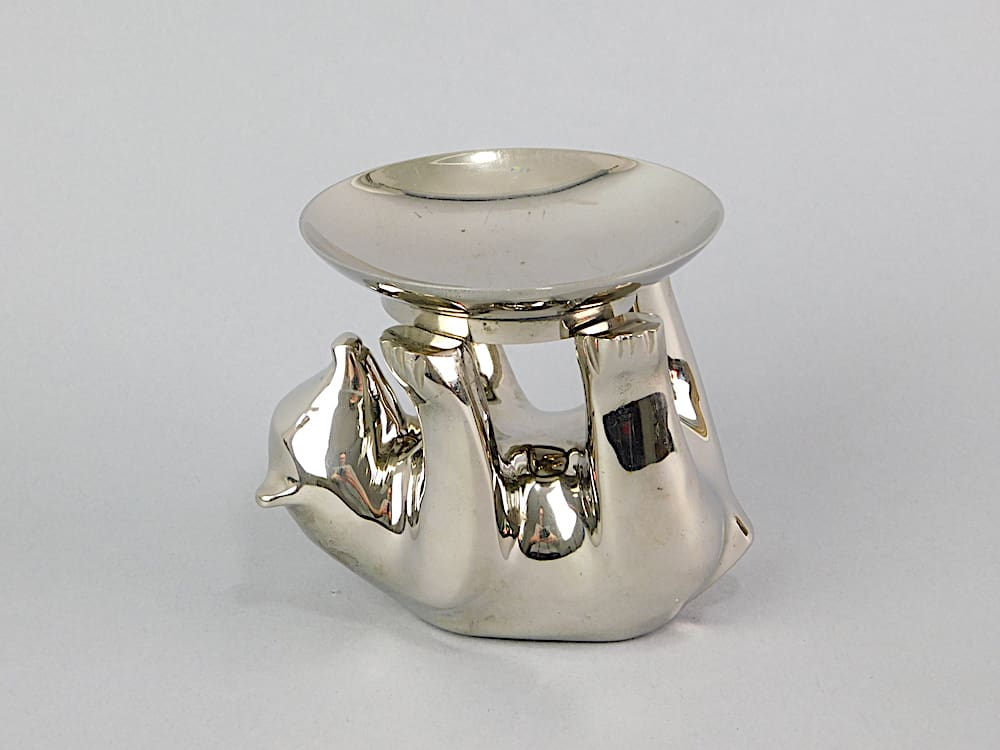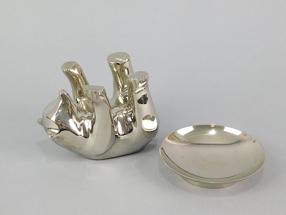 Stylised chrome plated bear peanut dish holder. He is holding a dish for peanuts or sweets.