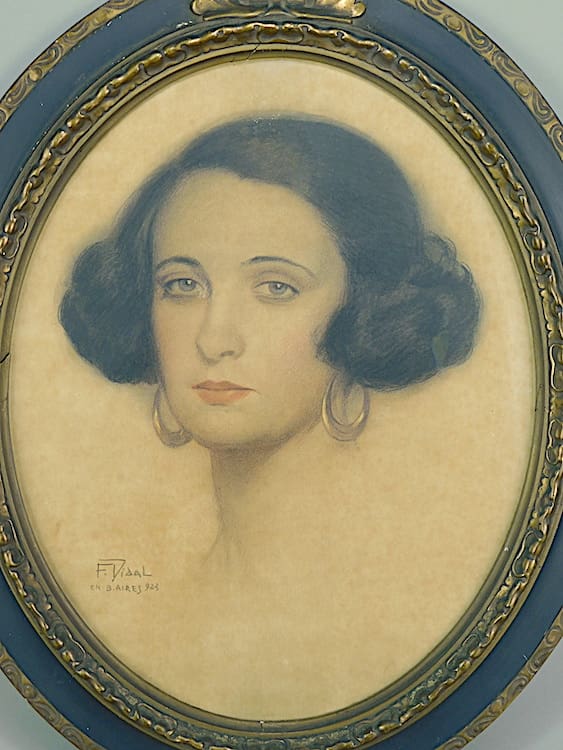 French pastille portrait Signed F. Vidal en Buenos Aries 923. So dated 1923, in Buenos Aries and signed. The original numbered Pintureria de Monserrat label is still on the reverse. In its original art deco gilt and ebonised gesso frame. The subject is unknown.