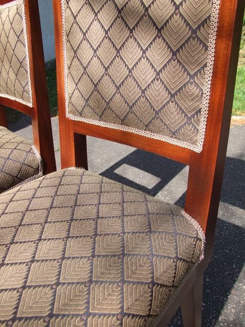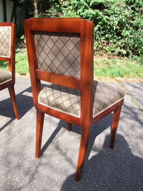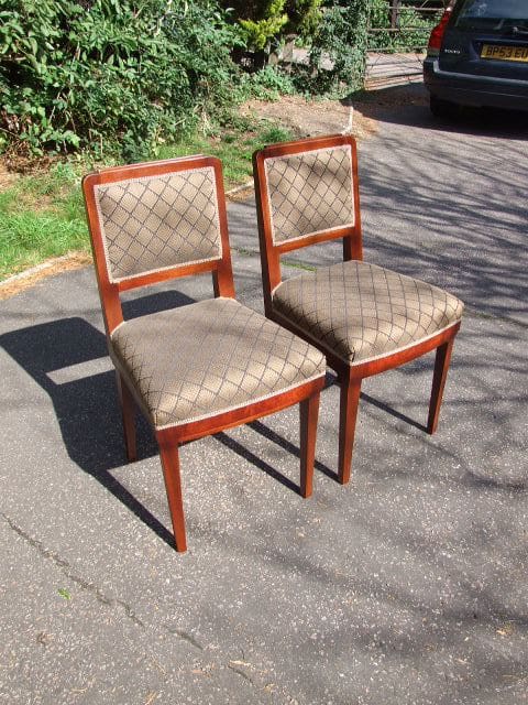 Pair of Belgian art deco bedroom chairs by the De Coene company and dating to the 1930’s. They have been fully restored and re upholstered. I actually also have the bedroom set to match them – (FN1179). Recovered in a gold and black fabric.