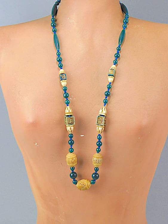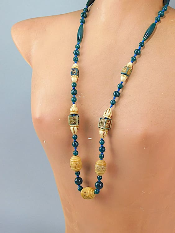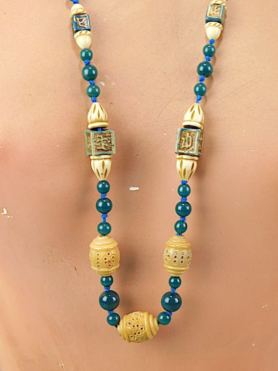 Blue and beige galalith Chinese style beads by the famous Belgian company of Ebena. Made in the early 1920’s.