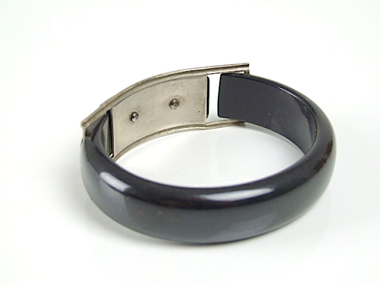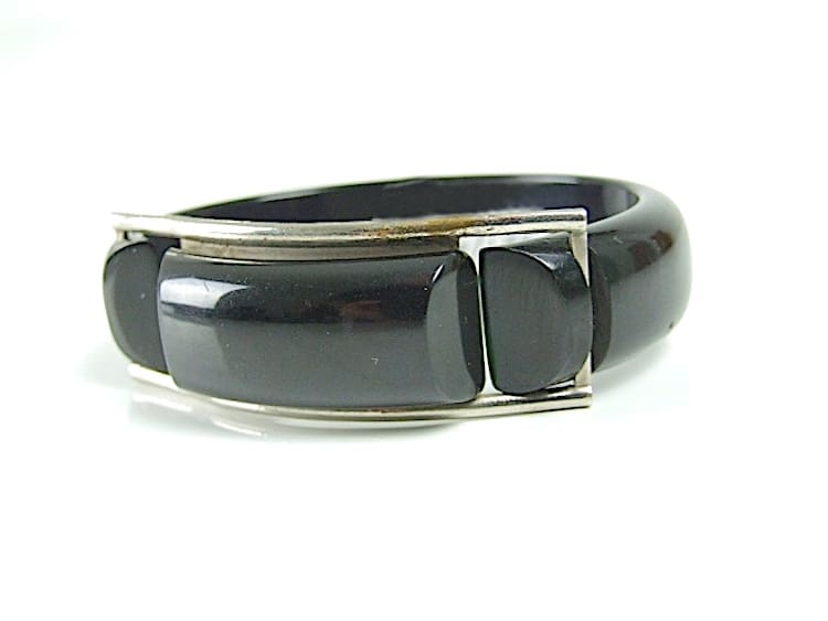 Black galalith and chrome bangle with leaver front lock. Will fit a small to medium size wrist.
