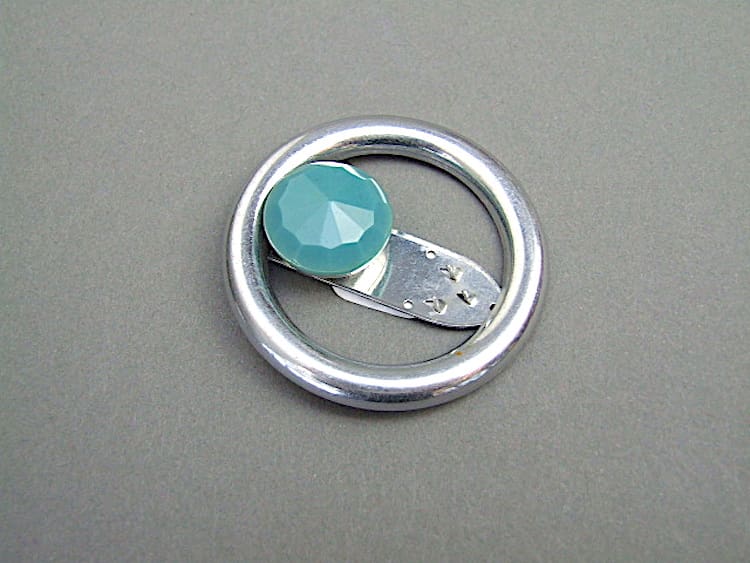 Blue galalith and chrome dress pin, made by Jakob Bengel.