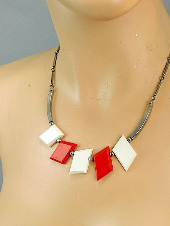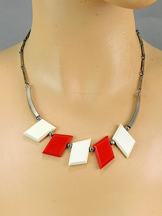 Cream and red galalith panels necklace, made in the early 1930’s by Jakob Bengel.