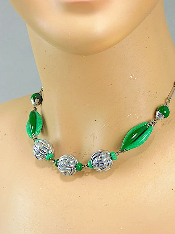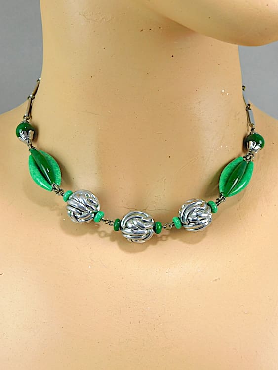 Marbled green glass and chrome necklace, made by Jakob Bengel in the early 1930’s and fitted with a screw clasp.