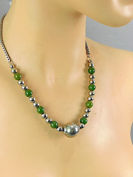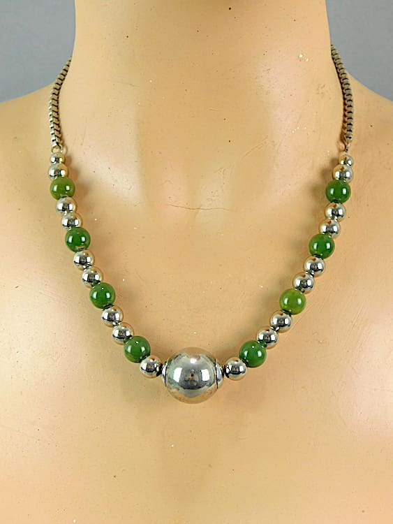 Chrome and green galalith ball necklace by the Jakob Bengel company. Made in the early 1930’s.