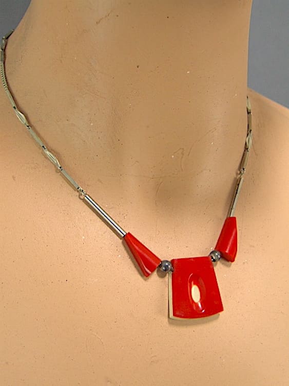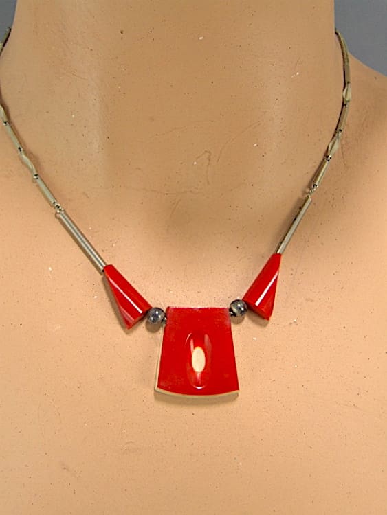 Red and cream galalith art deco necklace. Made by Bengel in the early 1930s.