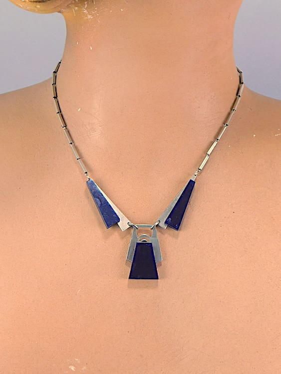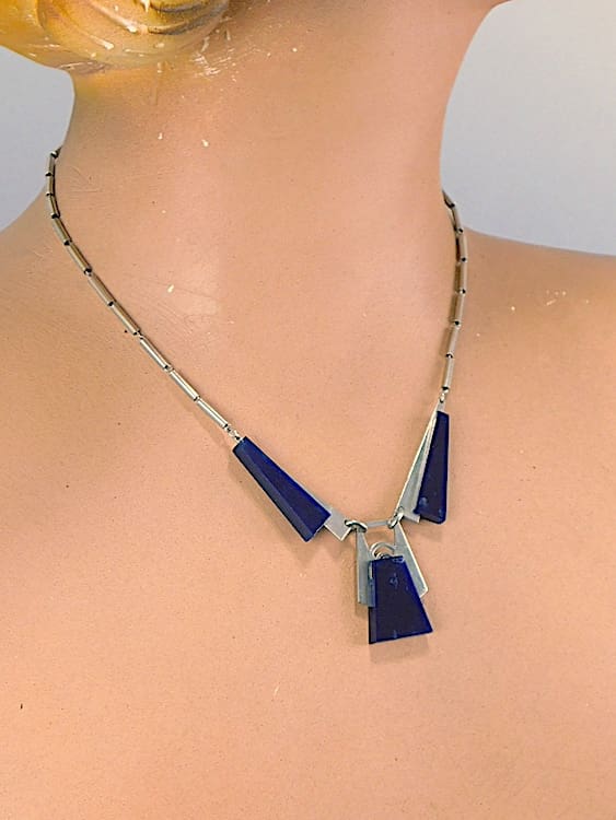 Navy blue galalith and chrome necklace by the Jakob Bengel company.