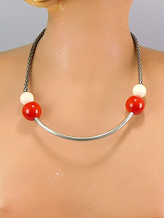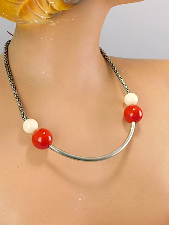 Chrome tube and red and white galalith ball necklace by the Jakob Bengel company. Made in the early 1930’s and fitted with a screw clasp.