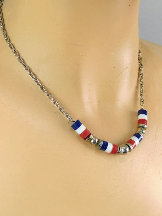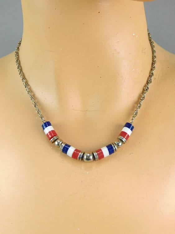 Stylish individual red, white and blue galalith rings with chrome balls necklace.