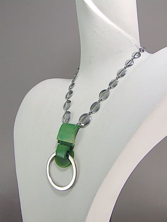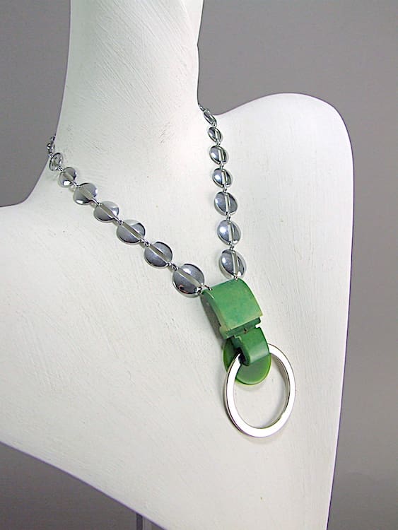 Amazing chrome and green galalith necklace made in the early 1930’s by Jakob Bengel. Chrome chain with cut-out circles detail, with a really big central pendant that measures 3.25 inches high.