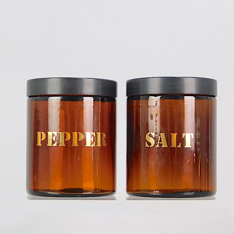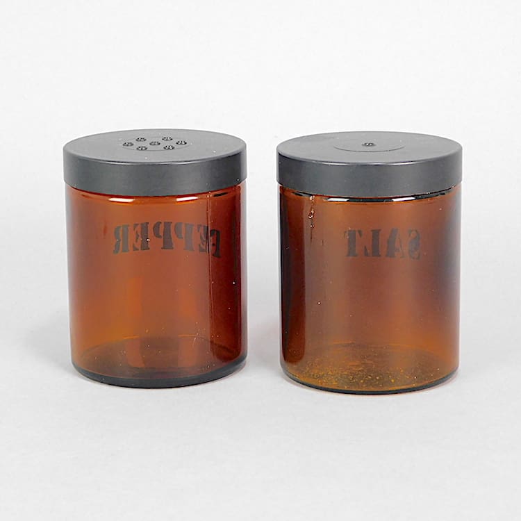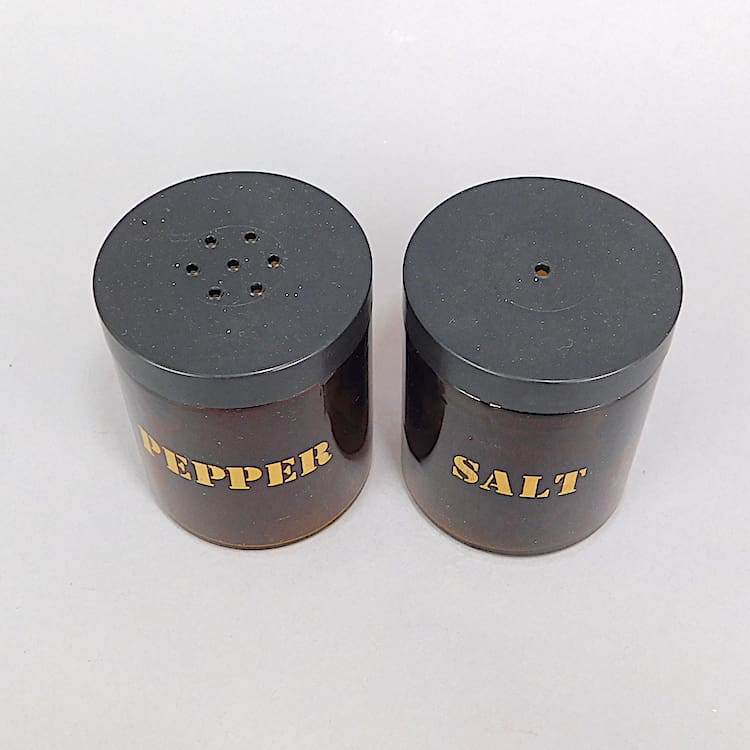 Rare original 1960s Biba cruet set Jars in brown glass with gold lettering. Sprinkle holes to the lids.