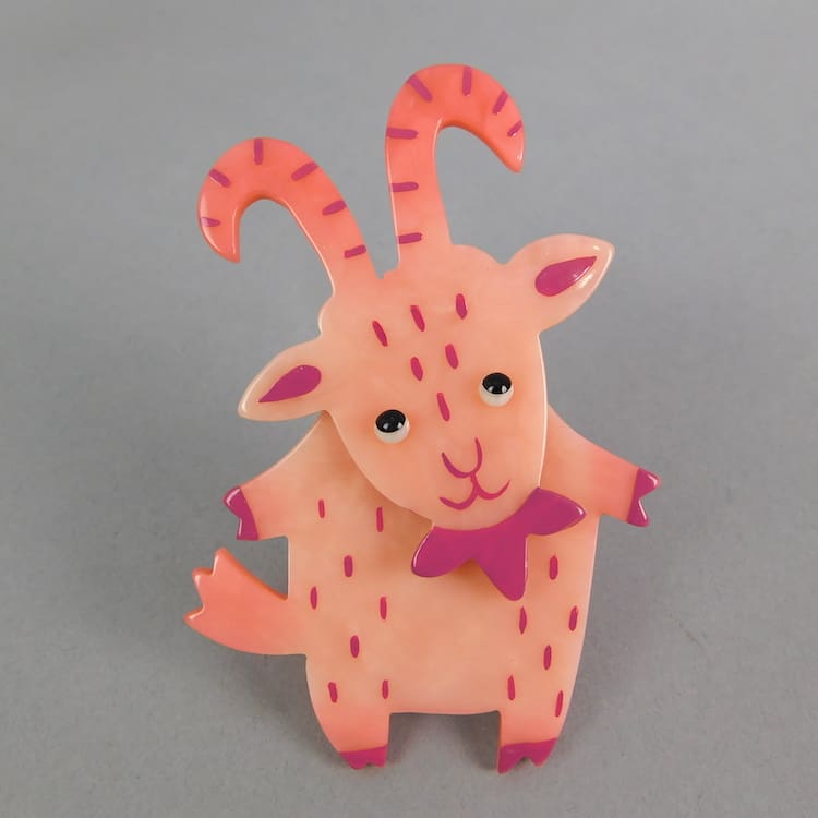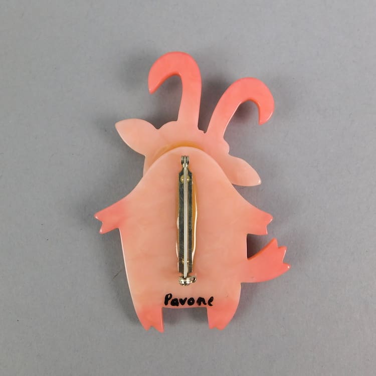 Vintage galalith, hand painted and hand made goat brooch by Pavone. Signed to the rear and fitted with a roll safety clasp. It measures 3.25 inches (8cm) high. Condition is new.