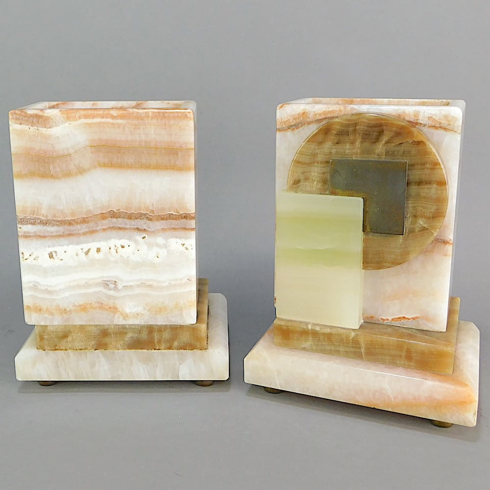 A colourful cubist Quetzal bird with original patina of green enamel and gold chest detail sits atop the geometric marble and onyx clock.