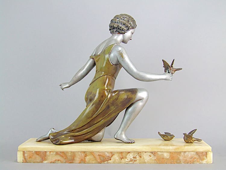 A French spelter kneeling lady with birds – although unsigned – attributed to Cipriani, in typical deco wavy hair and figure hugging dress with a sash sitting on a brown and cream onyx base.