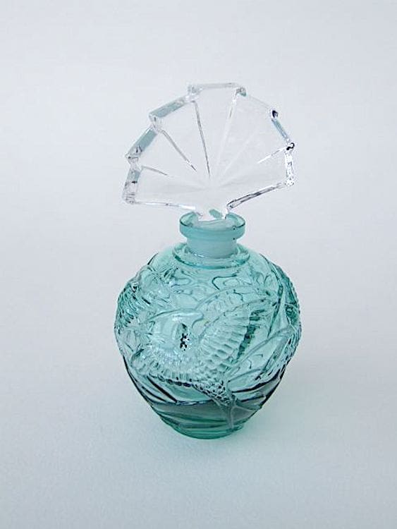 Pretty teal blue Czech glass contemporary scent bottle with a fan shaped stopper.