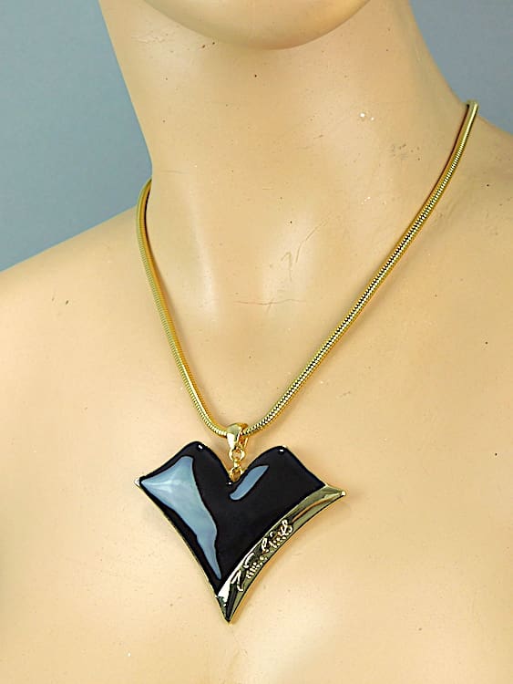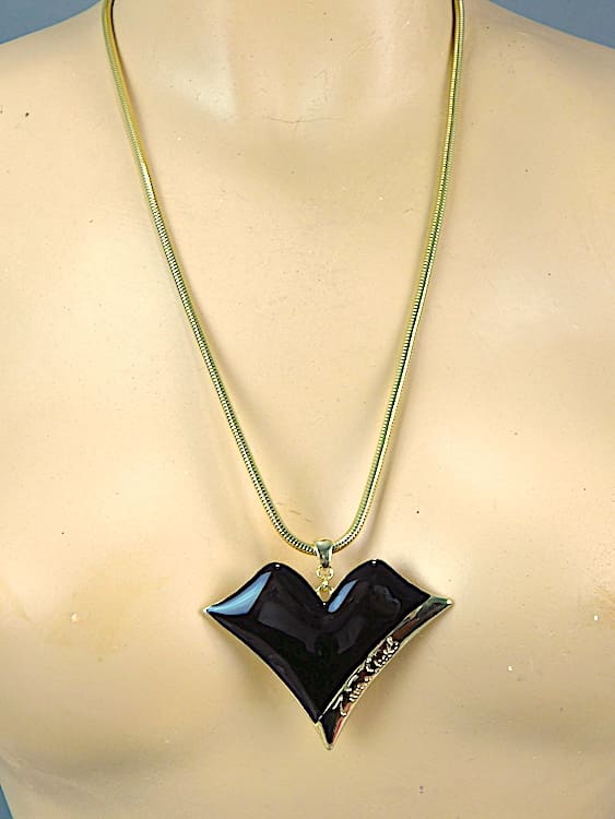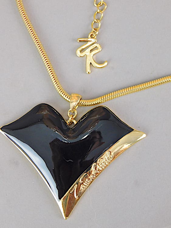 Vintage ZR black enamel lips with gilt metal snake chain necklace – no longer in production. Comes with its original pink ZR pouch.