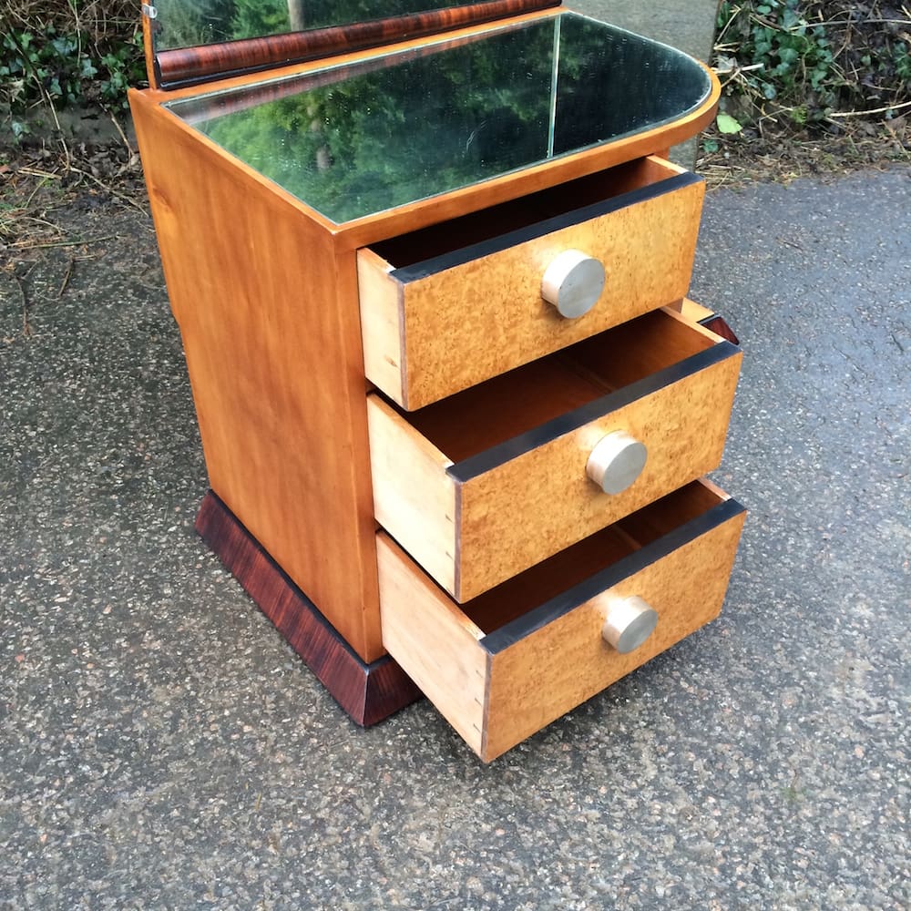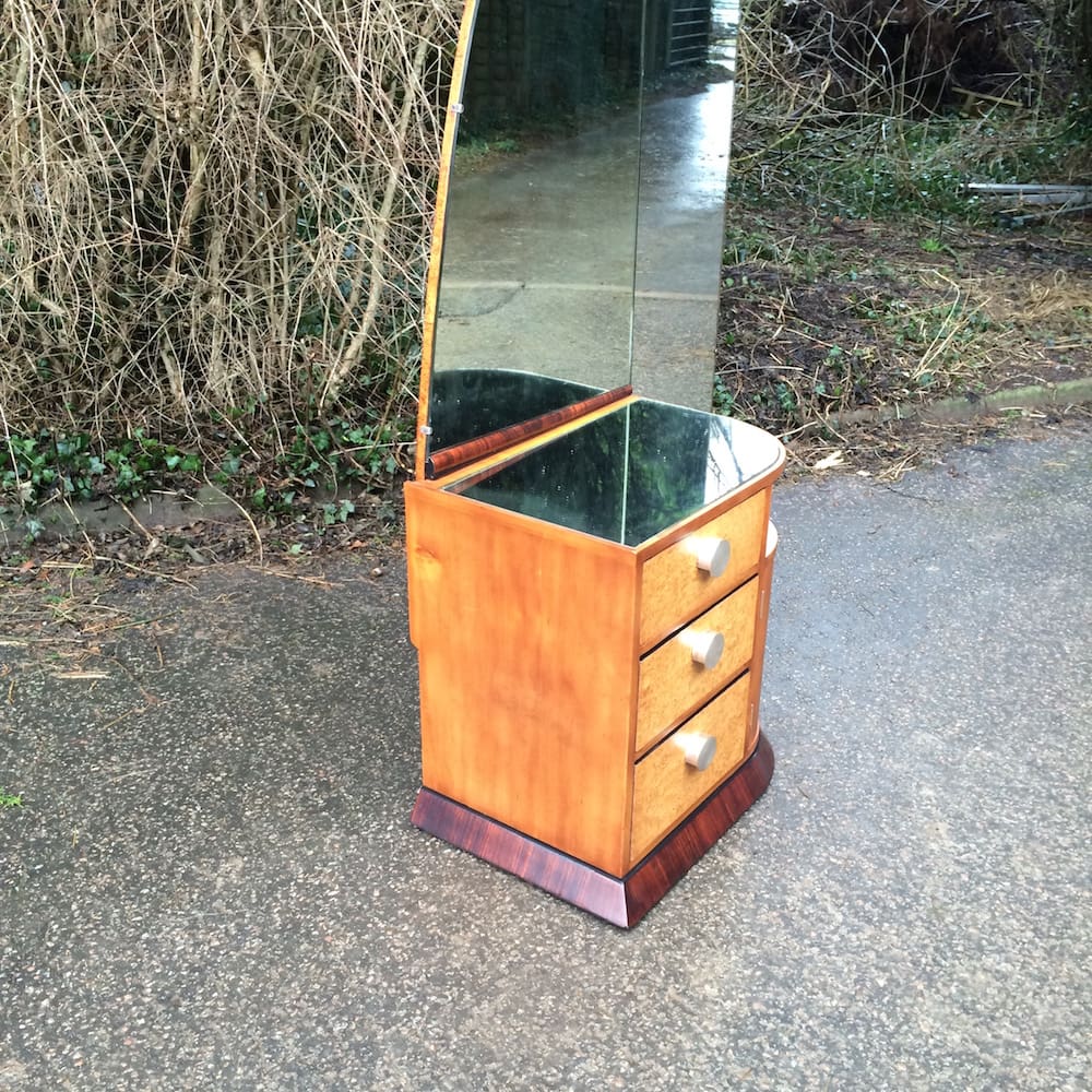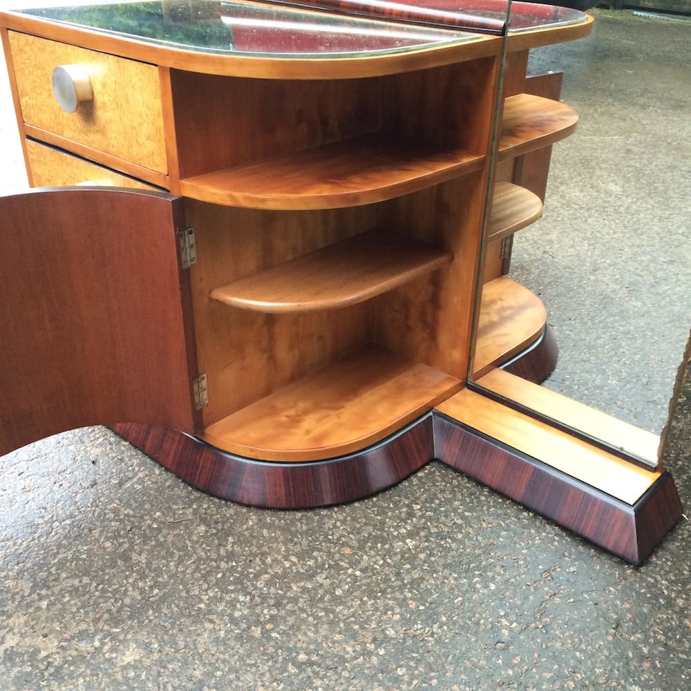 An interesting and unusual French art deco dressing table of 3 drawers with silvered bronze handles and adjacent curved side opening door with 3 internal shelves, below a covered shelf. Mirrored top and boat sail shaped glass mirror all mounted on a macassar plinth. Made of amboyne macassar and birch. Very good condition as recently renovated but with a few minor foxing marks to the original period mirror and the mirrored section on top of the cabinet which is easily replaced.