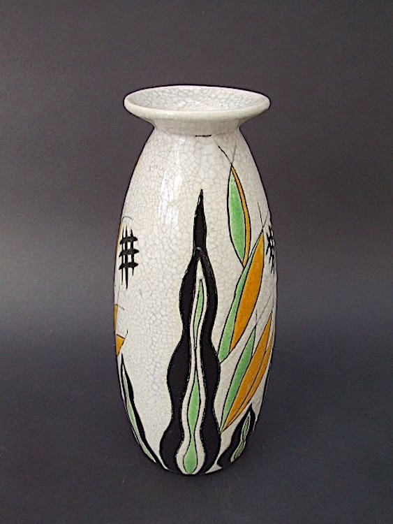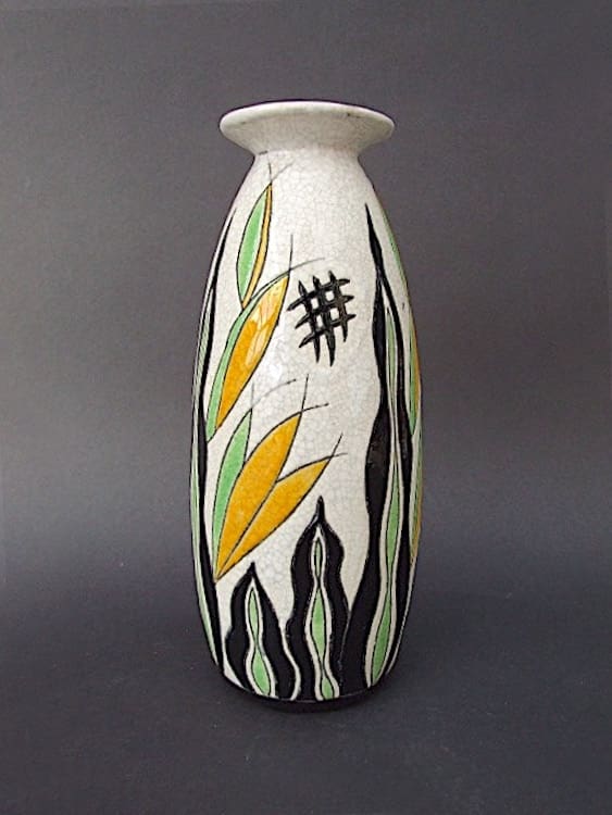 Belgian Boch Keramis vase, model number D1208. Decorated with stylised leaf patterning in green and yellows. Made I believe in the 1928, marked Keramis to the base.