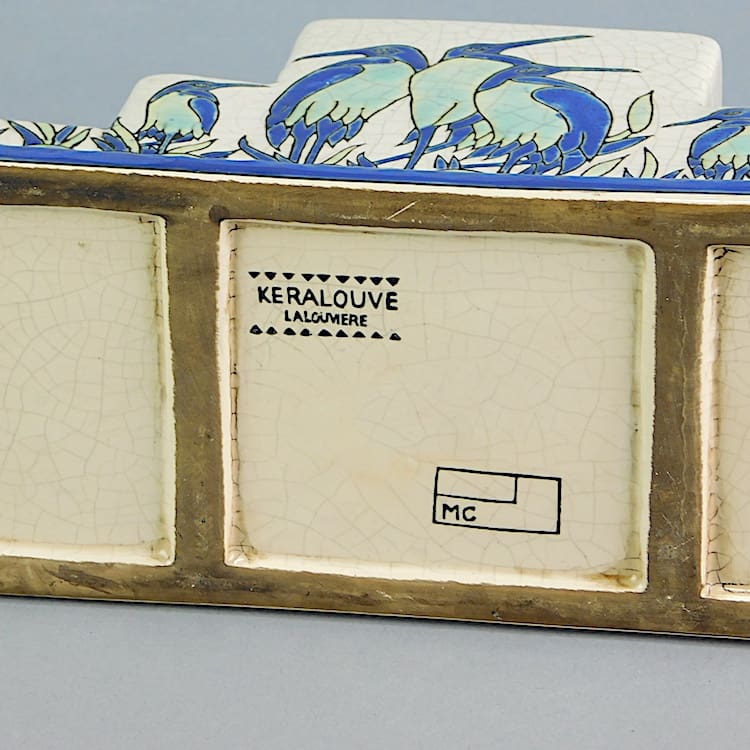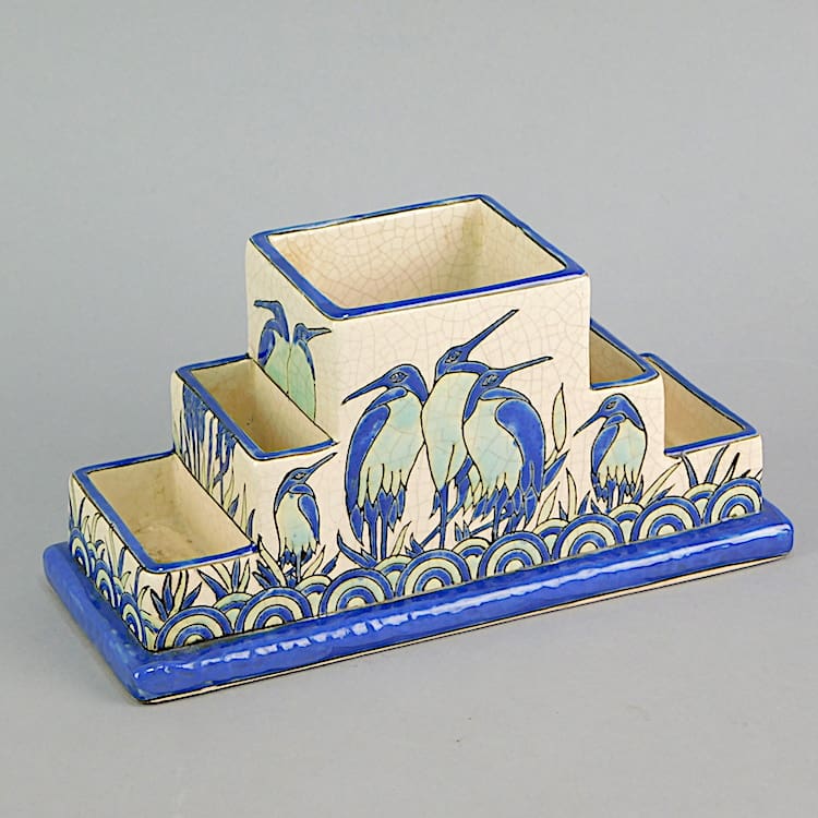Very stylish and usable desk tidy decorated with birds in the style of the highly sought after Boch Keramis pieces, but this one signed Keralouve to the base.