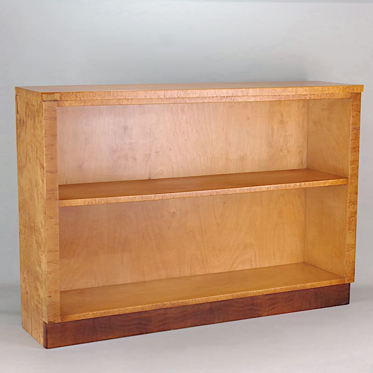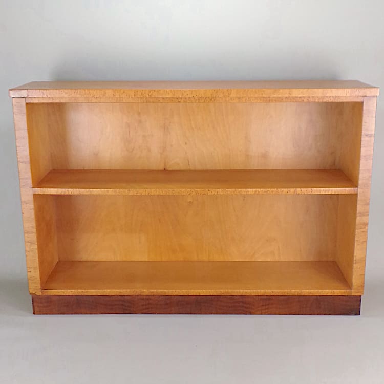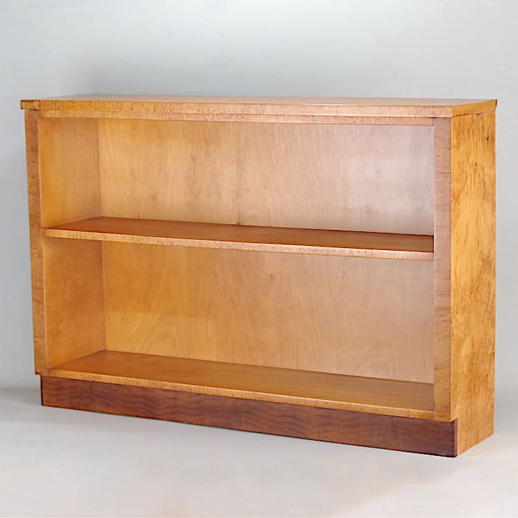 Art deco carolean birch low bookshelf Unit. The kick panel plinth is in a darker contrasting walnut veneer.