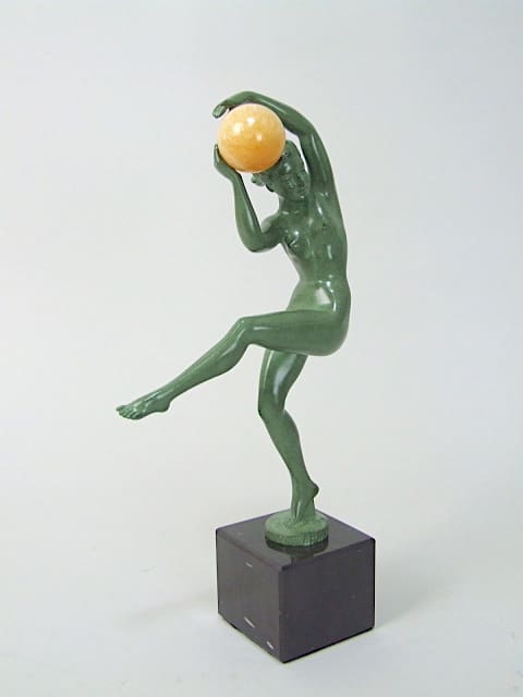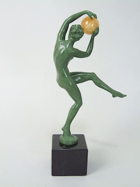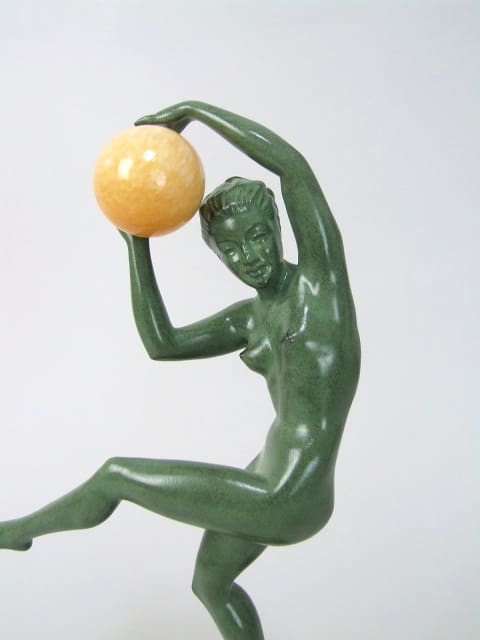 Spelter Ball Dancer by Bouraine. French art deco ball dancer figure holding an onyx ball. Green patinated on a black marble base. Designed by Marcel Bouraine and signed to the base in his pseudonym Briand.