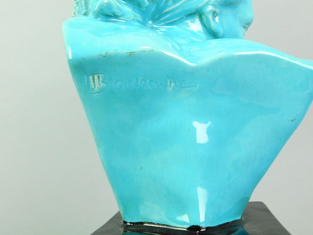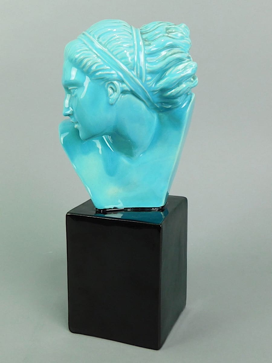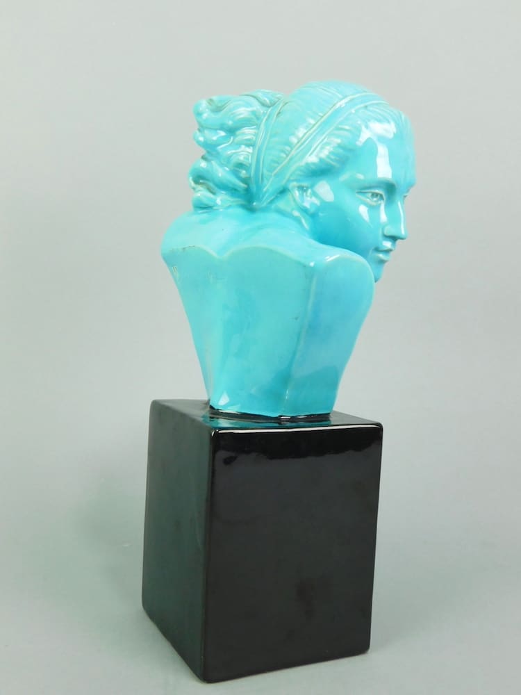 A blue glazed bust of a young woman with the lower base section in black glaze. Signed Bouraine to the reverse.